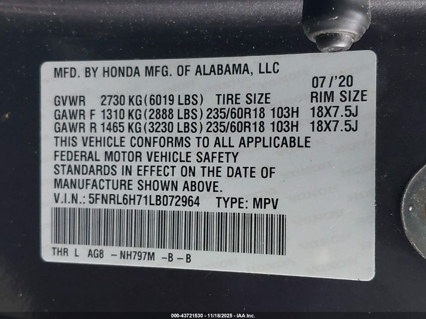 2020 HONDA ODYSSEY 2020 року Бензин, 3.5, Передній привід, vin - 5FNRL6H71LB072964 з США