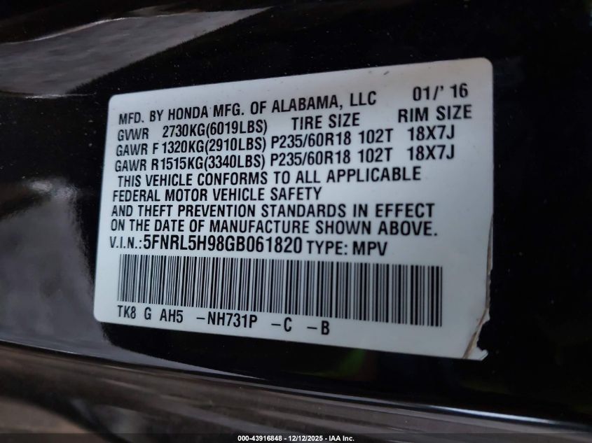 2016 HONDA ODYSSEY 2016 року Бензин, 3.5, Передній привід, vin - 5FNRL5H98GB061820 з США