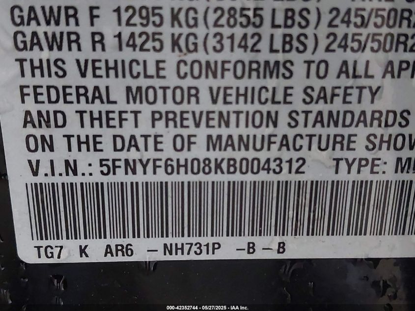 2019 HONDA PILOT 2019 року Бензин, 3.5, Повний привід, vin - 5FNYF6H08KB****** з США