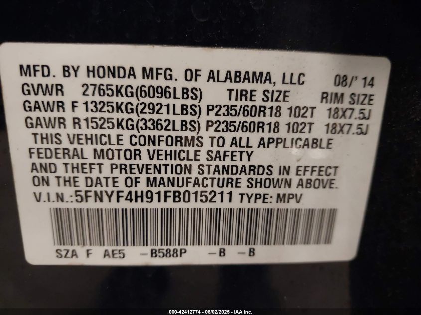 2015 HONDA PILOT 2015 року Бензин, 3.5, Повний привід, vin - 5FNYF4H91FB****** з США