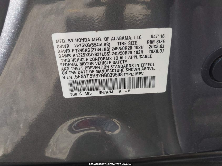 2016 HONDA PILOT EXL