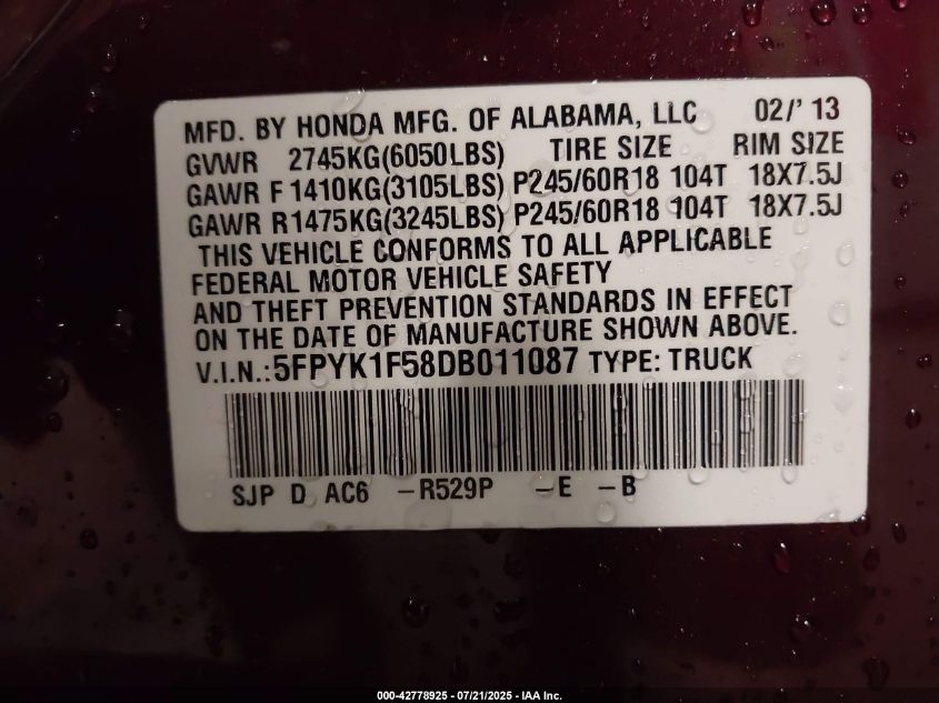 2013 HONDA RIDGELINE RTL