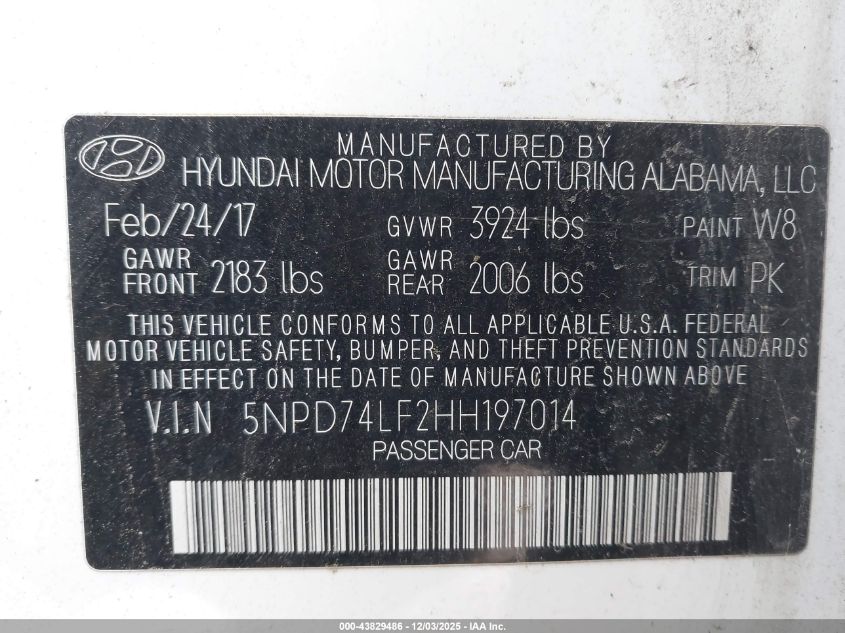 2017 HYUNDAI ELANTRA 2017 року Бензин, 2.0, Передній привід, vin - 5NPD74LF2HH197014 з США