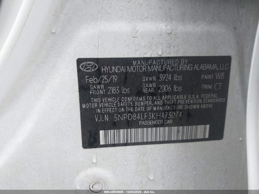 2019 HYUNDAI ELANTRA 2019 року Бензин, 2.0, Передній привід, vin - 5NPD84LF3KH473074 з США
