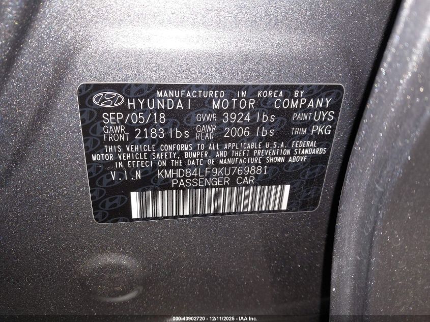 2019 HYUNDAI ELANTRA 2019 року Бензин, 2.0, Передній привід, vin - KMHD84LF9KU769881 з США