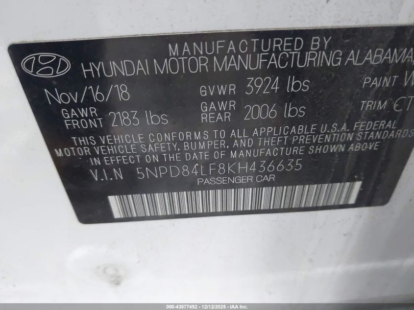 2019 HYUNDAI ELANTRA 2019 року Бензин, 2.0, Передній привід, vin - 5NPD84LF8KH436635 з США