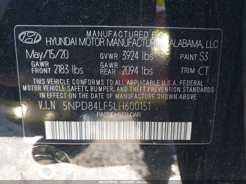 2020 HYUNDAI ELANTRA 2020 року Бензин, 2.0, Передній привід, vin - 5NPD84LF5LH600151 з США