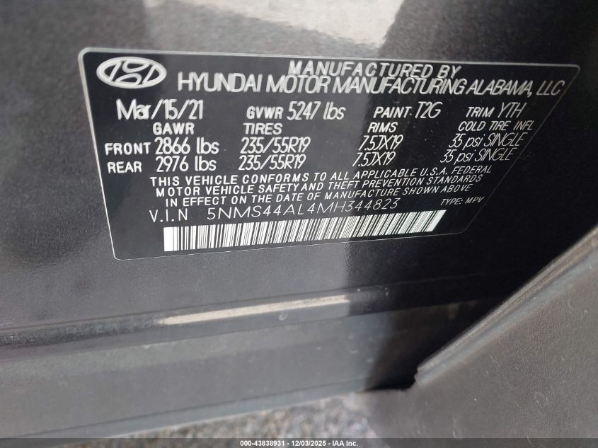 2021 HYUNDAI SANTA FE 2021 року Бензин, 2.5, Передній привід, vin - 5NMS44AL4MH344823 з США