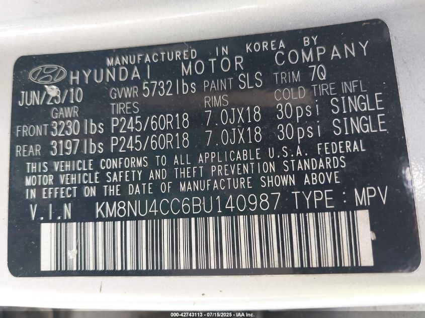 2011 HYUNDAI VERACRUZ 2011 року Бензин, 3.8, Передній привід, vin - KM8NU4CC6BU****** з США