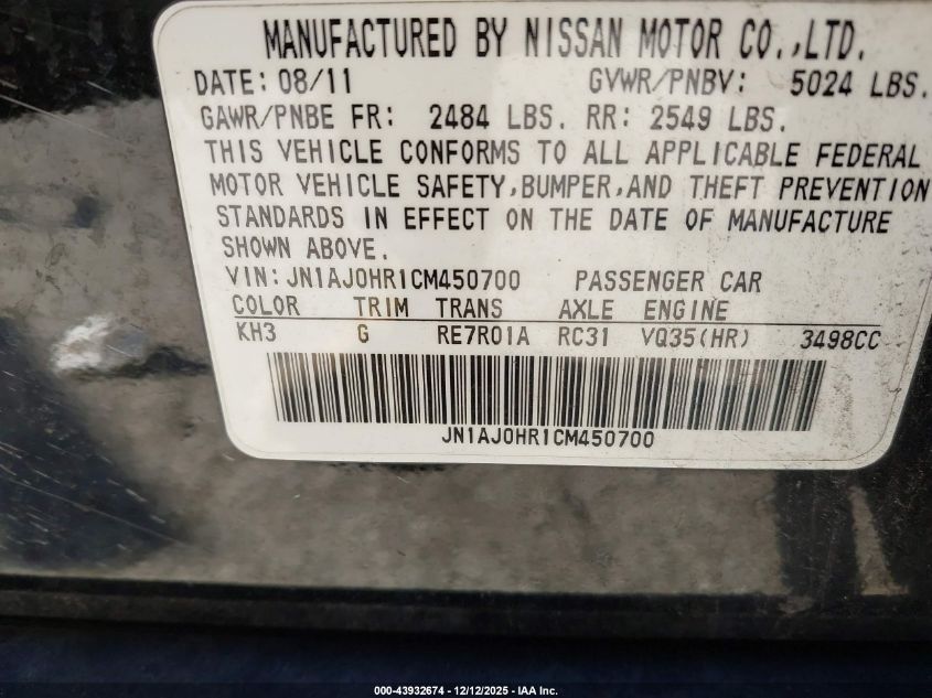 Колір ЧорнийЦиліндри 6Привід Повний привідVIN JN1AJ0HR1CM450700Стан Заводиться та їде (перевірено)Ушкодження Передня або задняДата аукціону 2025-12-17 AutoRIA