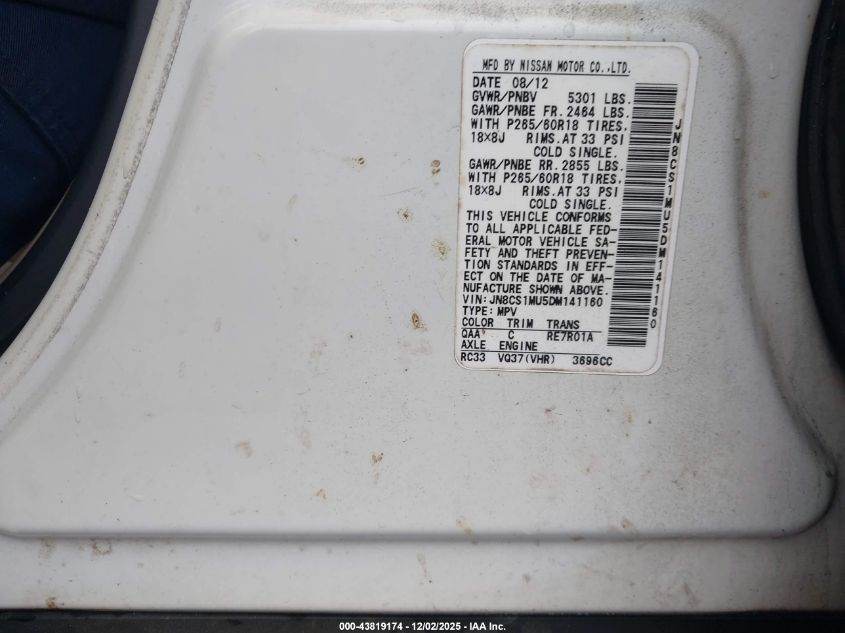 Колір БілийЦиліндри 6VIN JN8CS1MU5DM141160Стан Заводиться та їде (перевірено)Ушкодження Передня або задня AutoRIA