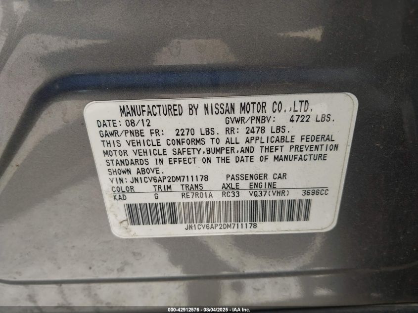 Колір СірийЦиліндри 6Привід Задній привідVIN JN1CV6AP2DM******Стан НевідомоУшкодження Незначні