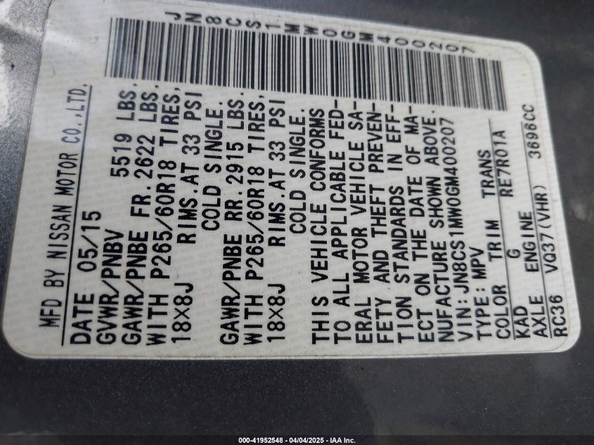 Колір СірийЦиліндри 6Привід Повний привідVIN JN8CS1MW0GM******Стан НевідомоУшкодження З боківДата аукціону 2025-06-30