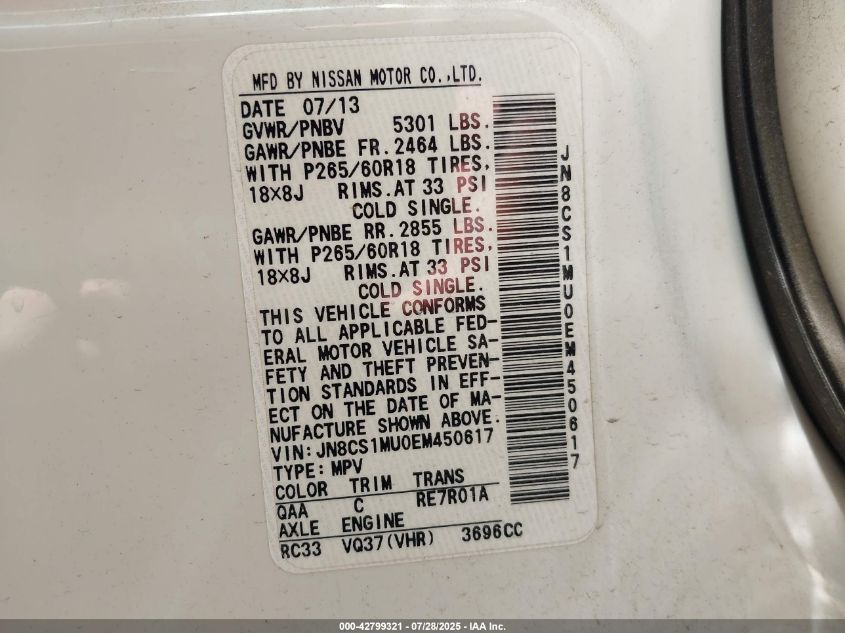 Колір БілийЦиліндри 6Привід НевідомоVIN JN8CS1MU0EM******Стан НевідомоУшкодження ГрадДата аукціону 2025-09-30