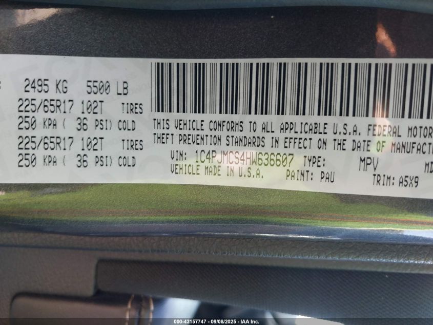 Колір СірийЦиліндри 6Привід Повний привідVIN 1C4PJMCS4HW636607Стан Заводиться та їде (перевірено)Ушкодження Передня або задняДата аукціону 2025-10-21
