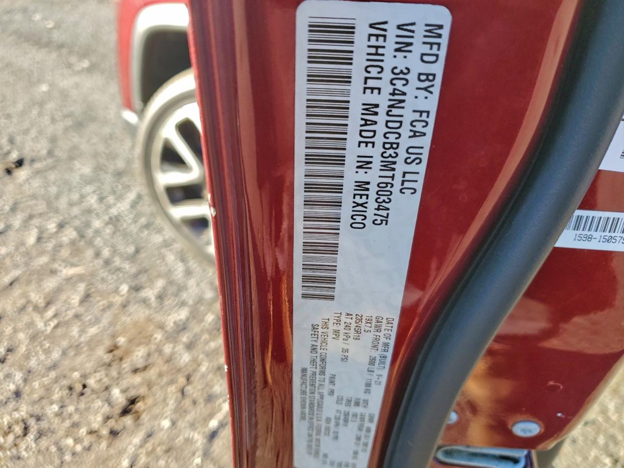 Колір ЧервонийЦиліндри 4Привід 4x4 з переднім приводомVIN 3C4NJDCB3MT603475Стан Заводиться та їде (перевірено)Ушкодження Передня або задняДата аукціону 2025-12-08 AutoRIA