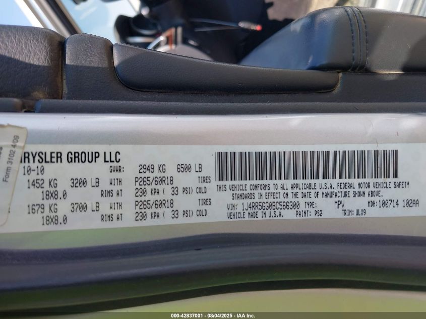 Колір СрібнийЦиліндри 6Привід Повний привідVIN 1J4RR5GG0BC566300Стан Заводиться та їде (перевірено)Ушкодження Передня або задняДата аукціону 2025-11-19