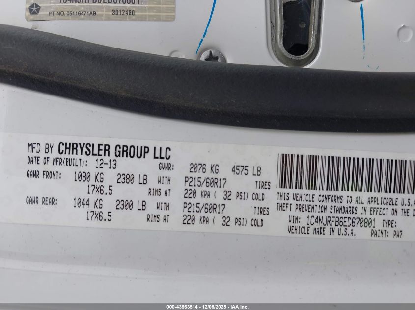 Колір БілийЦиліндри 4Привід Повний привідVIN 1C4NJRFB6ED670801Стан Заводиться та їде (перевірено)Ушкодження Звичайний зносДата аукціону 2025-12-15 AutoRIA