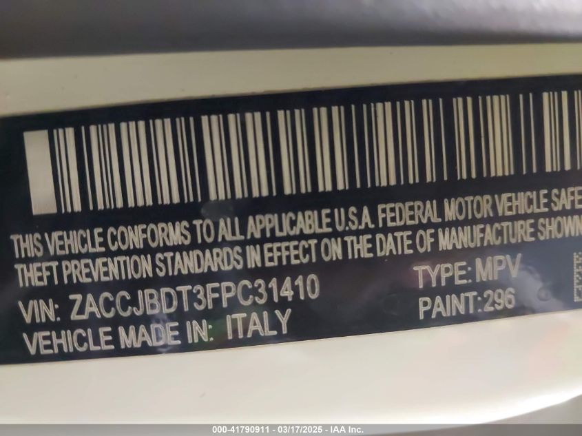 Колір БілийЦиліндри 4Привід Повний привідVIN ZACCJBDT3FPC31410Стан Заводиться та їде (перевірено)Ушкодження ЗадняДата аукціону 2025-10-22