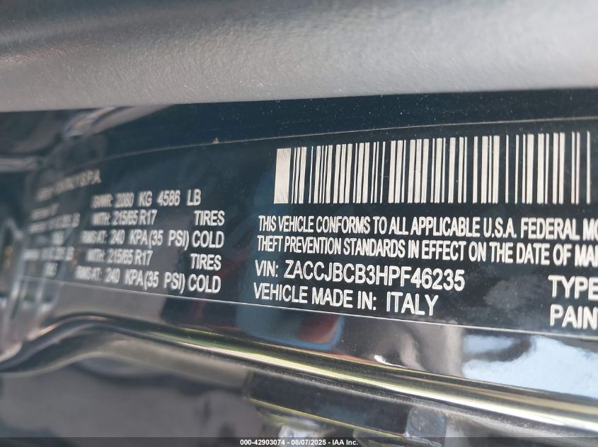 Колір ЧорнийЦиліндри 4Привід Повний привідVIN ZACCJBCB3HPF46235Стан СтаціонарноУшкодження Передня або задня AutoRIA