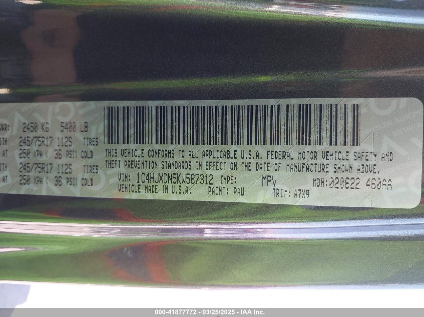 Колір СірийЦиліндри 4Привід Повний привідVIN 1C4HJXDN5KW******Стан НевідомоУшкодження ВандалізмДата аукціону 2025-08-21