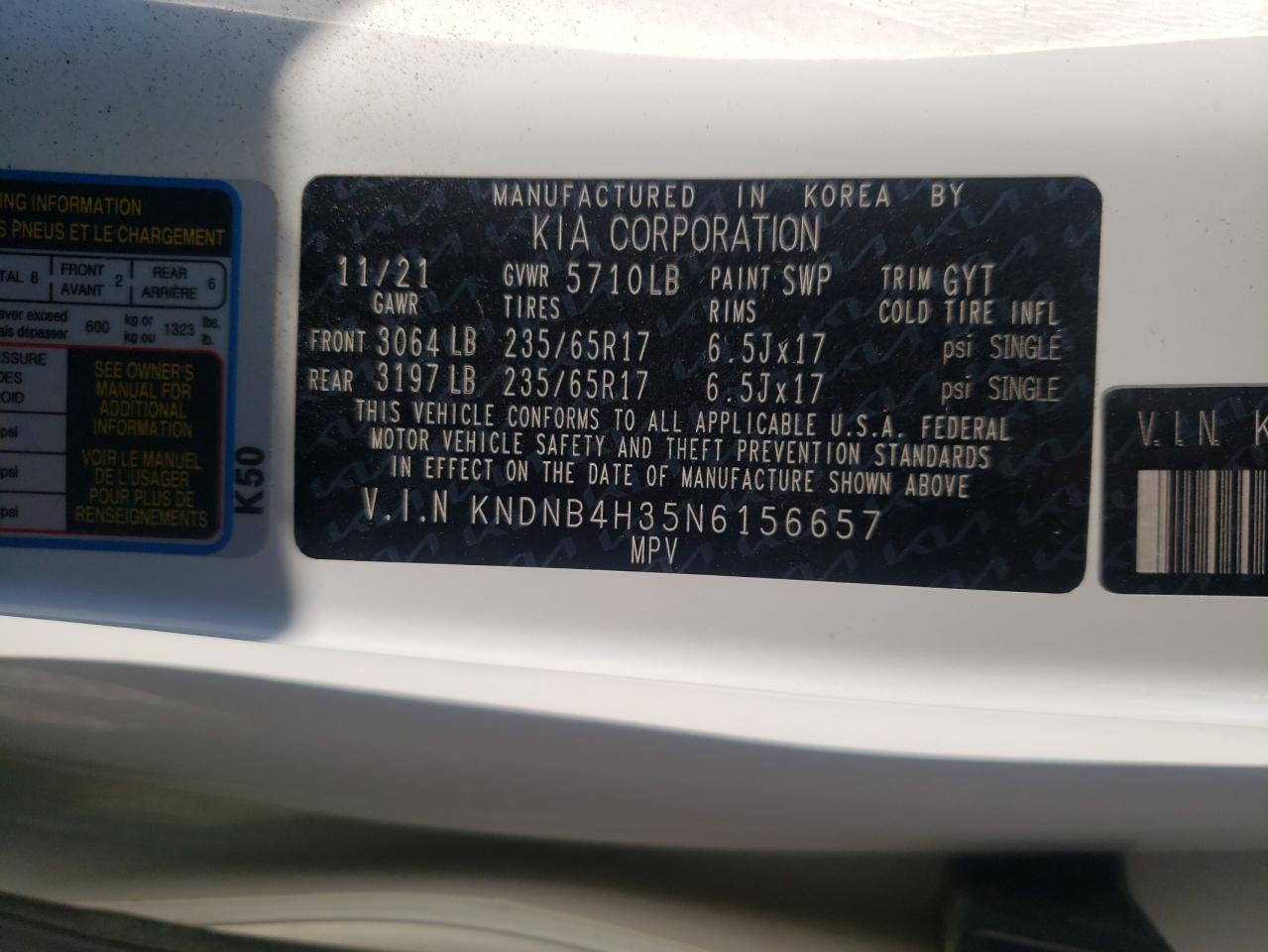 Колір БілийЦиліндри 6VIN KNDNB4H35N6156657Стан Заводиться та їде (перевірено)Ушкодження Передня або задняДата аукціону 2025-09-12
