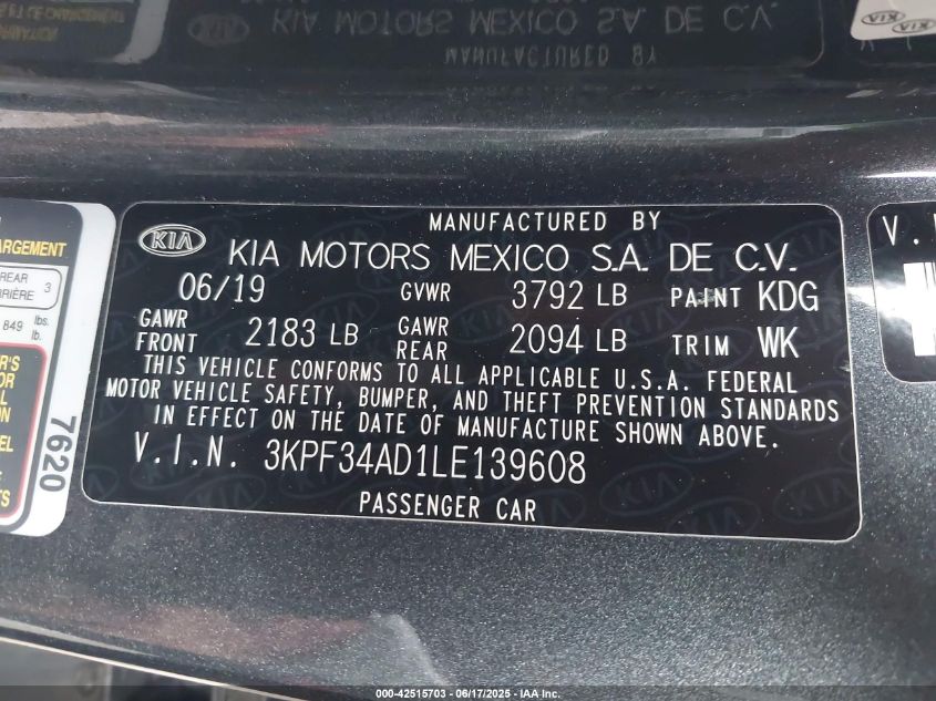 2020 KIA FORTE 2020 року Бензин, 2.0, Передній привід, vin - 3KPF34AD1LE139608 з США
