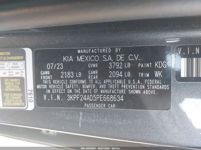 2023 KIA FORTE 2023 року Бензин, 2.0, Передній привід, vin - 3KPF24AD5PE668634 з США