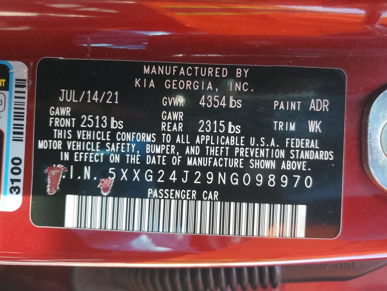 2022 KIA K5 2022 року Бензин, 1.6, , vin - 5XXG24J29NG098970 з США