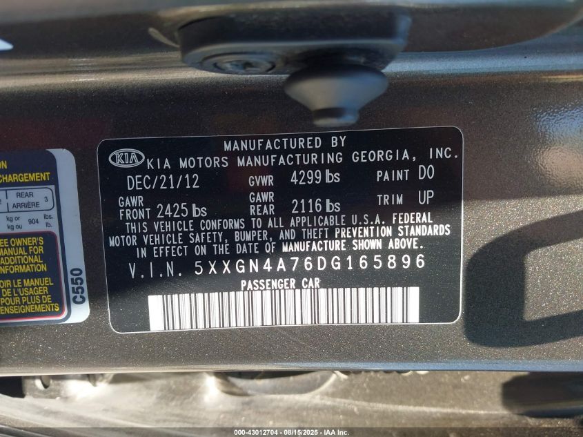2013 KIA OPTIMA 2013 року Бензин, 2.4, Передній привід, vin - 5XXGN4A76DG165896 з США