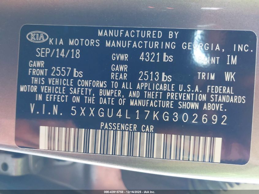 2019 KIA OPTIMA 2019 року Бензин, 1.6, Передній привід, vin - 5XXGU4L17KG302692 з США