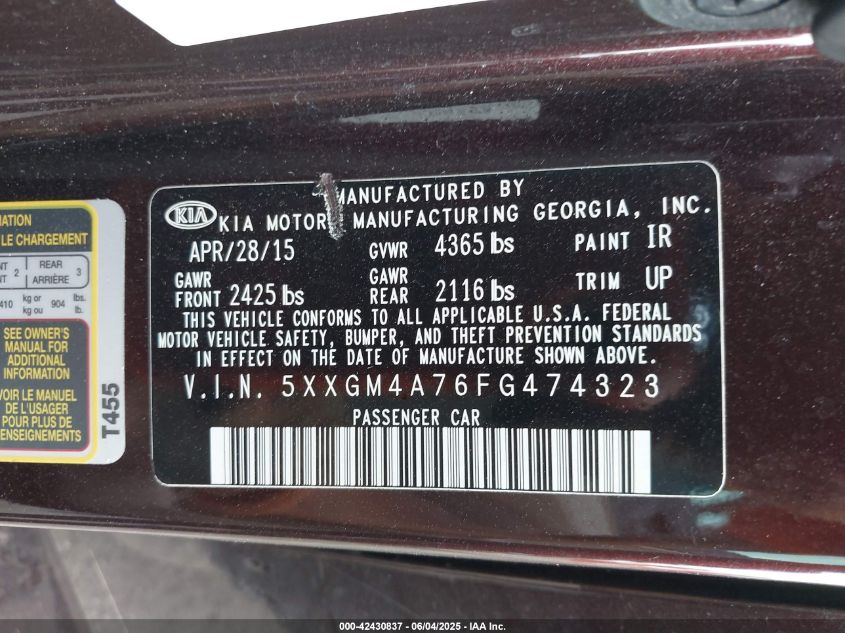 2015 KIA OPTIMA 2015 року Бензин, 2.4, Передній привід, vin - 5XXGM4A76FG****** з США