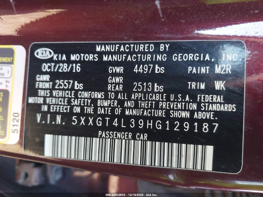 2017 KIA OPTIMA 2017 року Бензин, 2.4, Передній привід, vin - 5XXGT4L39HG129187 з США