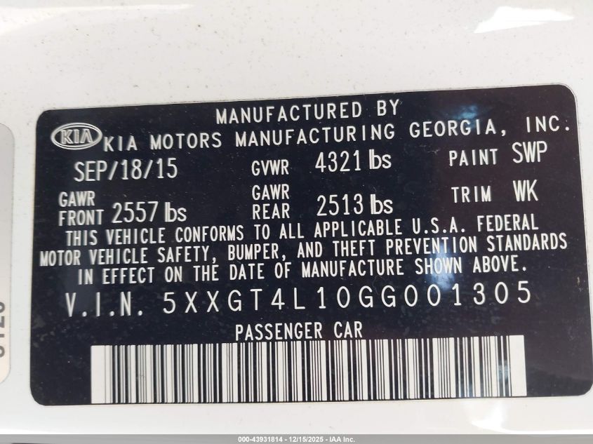 2016 KIA OPTIMA 2016 року Бензин, 1.6, Передній привід, vin - 5XXGT4L10GG001305 з США