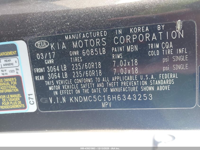 2017 KIA SEDONA 2017 року Бензин, 3.3, Передній привід, vin - KNDMC5C16H6343253 з США