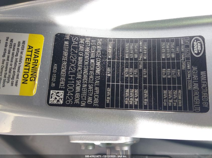 2020 LAND ROVER RANGE ROVER EVOQUE 2020 року Бензин, 2.0, Повний привід, vin - SALZJ2FX2LH100426 з США