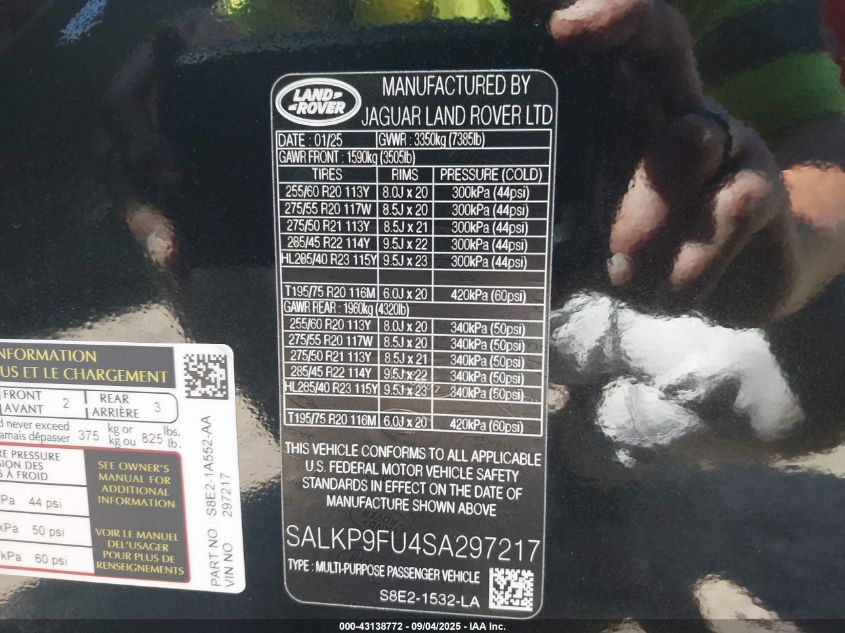 2025 LAND ROVER RANGE ROVER 2025 року Бензин, 3.0, Повний привід, vin - SALKP9FU4SA297217 з США