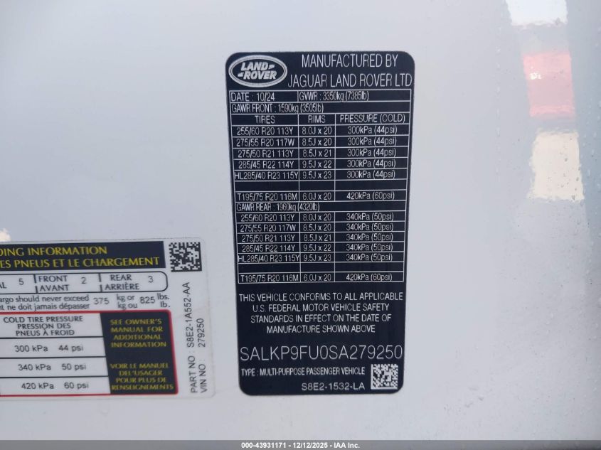 2025 LAND ROVER RANGE ROVER 2025 року Бензин, 3.0, Повний привід, vin - SALKP9FU0SA279250 з США