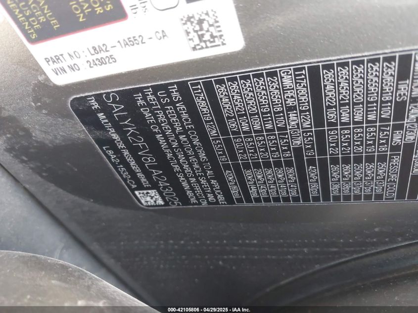 2020 LAND ROVER RANGE ROVER VELAR 2020 року Бензин, 3.0, Повний привід, vin - SALYK2FV8LA****** з США
