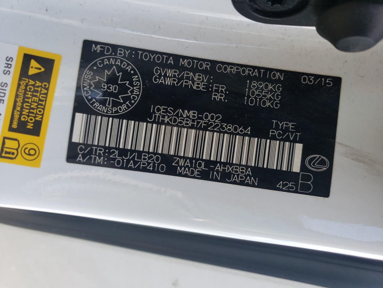 2015 LEXUS CT 200H 2015 року Гібрид, 1.8, , vin - JTHKD5BH7F2238064 з США