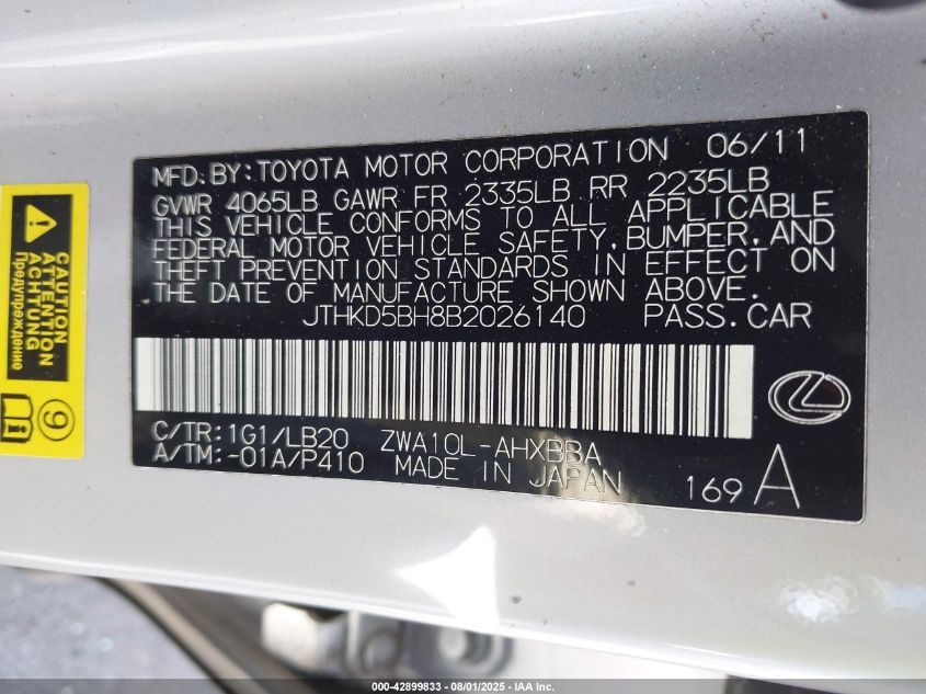 2011 LEXUS CT 200H 2011 року Гібрид, 1.8, Передній привід, vin - JTHKD5BH8B2026140 з США