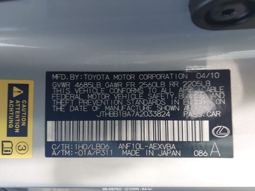 2010 LEXUS HS 250H 2010 року Гібрид, 2.4, Передній привід, vin - JTHBB1BA7A2033824 з США