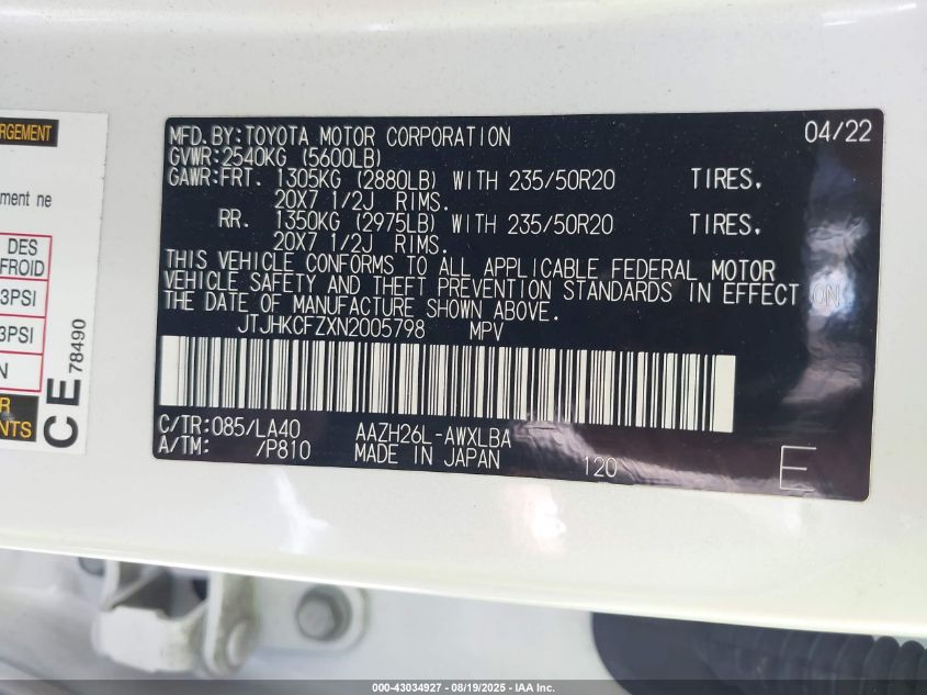 Колір БілийЦиліндри 4Привід Повний привідVIN JTJHKCFZXN2005798Стан СтаціонарноУшкодження Передня або задняДата аукціону 2025-10-06