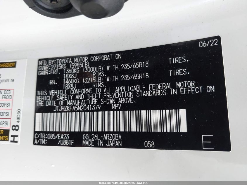 Колір БілийЦиліндри 6Привід Повний привідVIN JTJHZKFA5N2******Стан НевідомоУшкодження Передня або задняДата аукціону 2025-10-01
