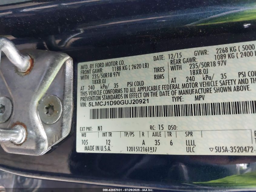 2016 LINCOLN MKC 2016 року Бензин, 2.0, Повний привід, vin - 5LMCJ1D90GU****** з США
