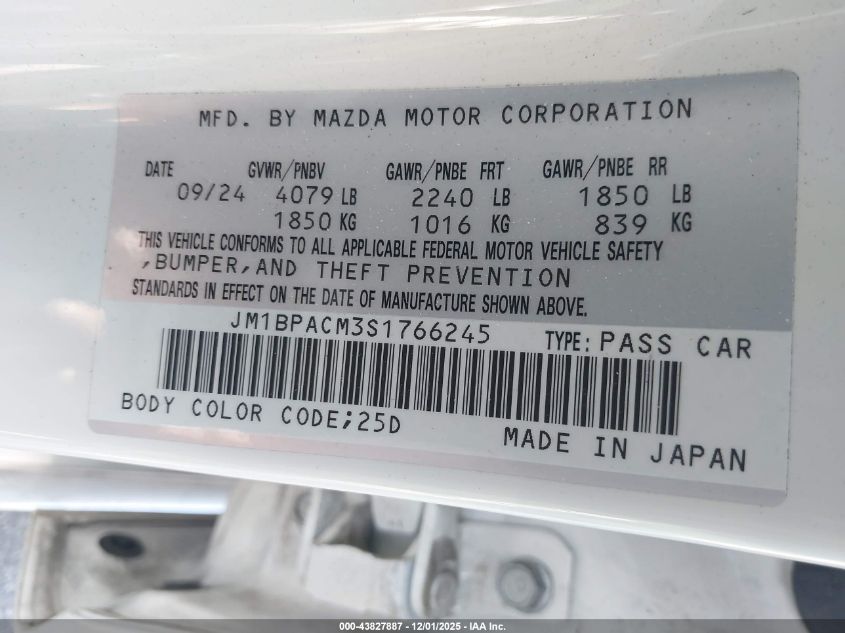 2025 MAZDA 3 2025 року Бензин, 2.5, Передній привід, vin - JM1BPACM3S1766245 з США