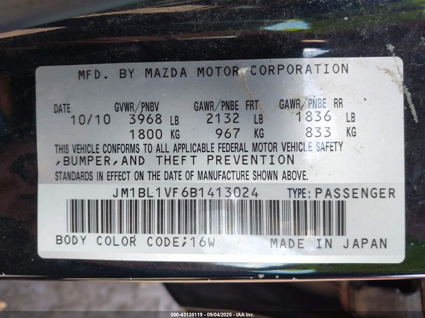 Колір ЧорнийЦиліндри 4Привід Передній привідVIN JM1BL1VF6B1******Стан НевідомоУшкодження Передня і задня Дата аукціону 2025-09-25