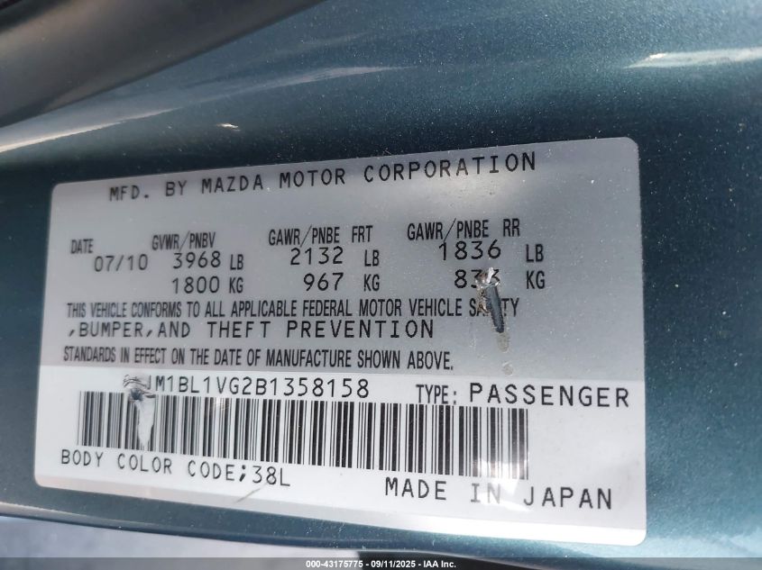 Колір СірийЦиліндри 4Привід Передній привідVIN JM1BL1VG2B1******Стан НевідомоУшкодження Передня праваДата аукціону 2025-10-01