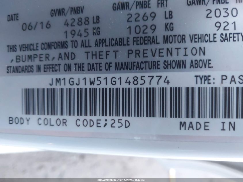 2016 MAZDA 6 2016 року Бензин, 2.5, Передній привід, vin - JM1GJ1W51G1485774 з США