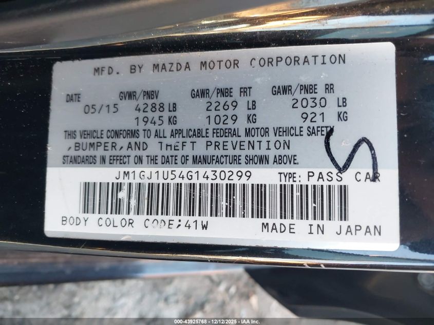 2016 MAZDA 6 2016 року Бензин, 2.5, Передній привід, vin - JM1GJ1U54G1430299 з США